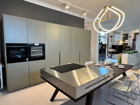 @HOME Il dinamismo che connota gli ambienti delle case contemporanee chiede soluzioni che organizzino in modo flessibile gli spazi e le loro funzioni. L’isola Wing racchiude in soli 115 cm di profondità la zona cottura per la preparazione del cibo e l’accoglienza, grazie all’elegante pannello sul retro dell’isola che quando occorre si trasforma in un comodo tavolo.